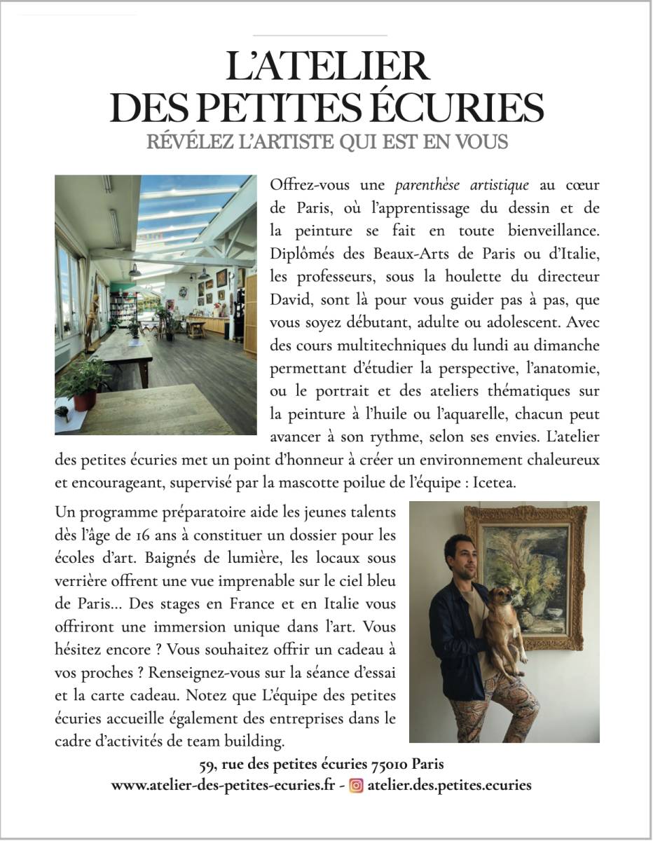 L'Atelier des Petites Écuries, école de dessin et de peinture pour adultes et adolescents située en plein cœur de Paris, est fier d'annoncer sa parution dans le magazine ELLE du 30 janvier 2025.