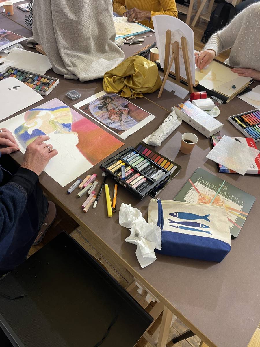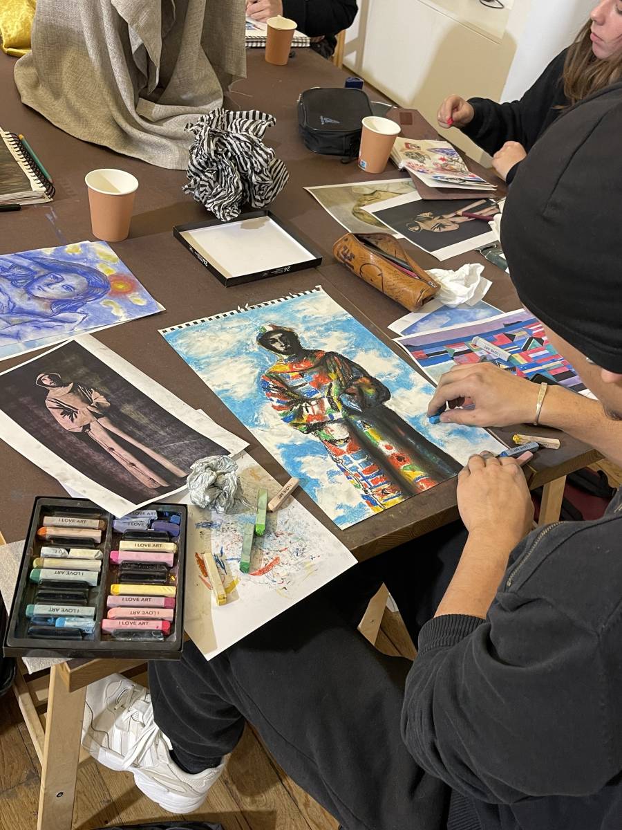À l’atelier, les élèves apprennent à jouer avec les contrastes, les harmonies colorées et les textures propres au pastel.