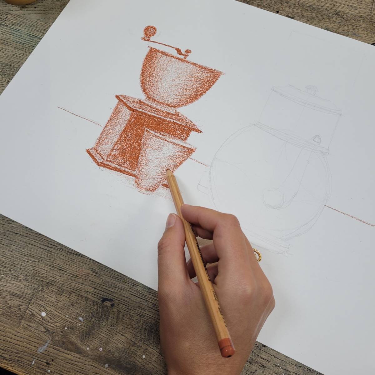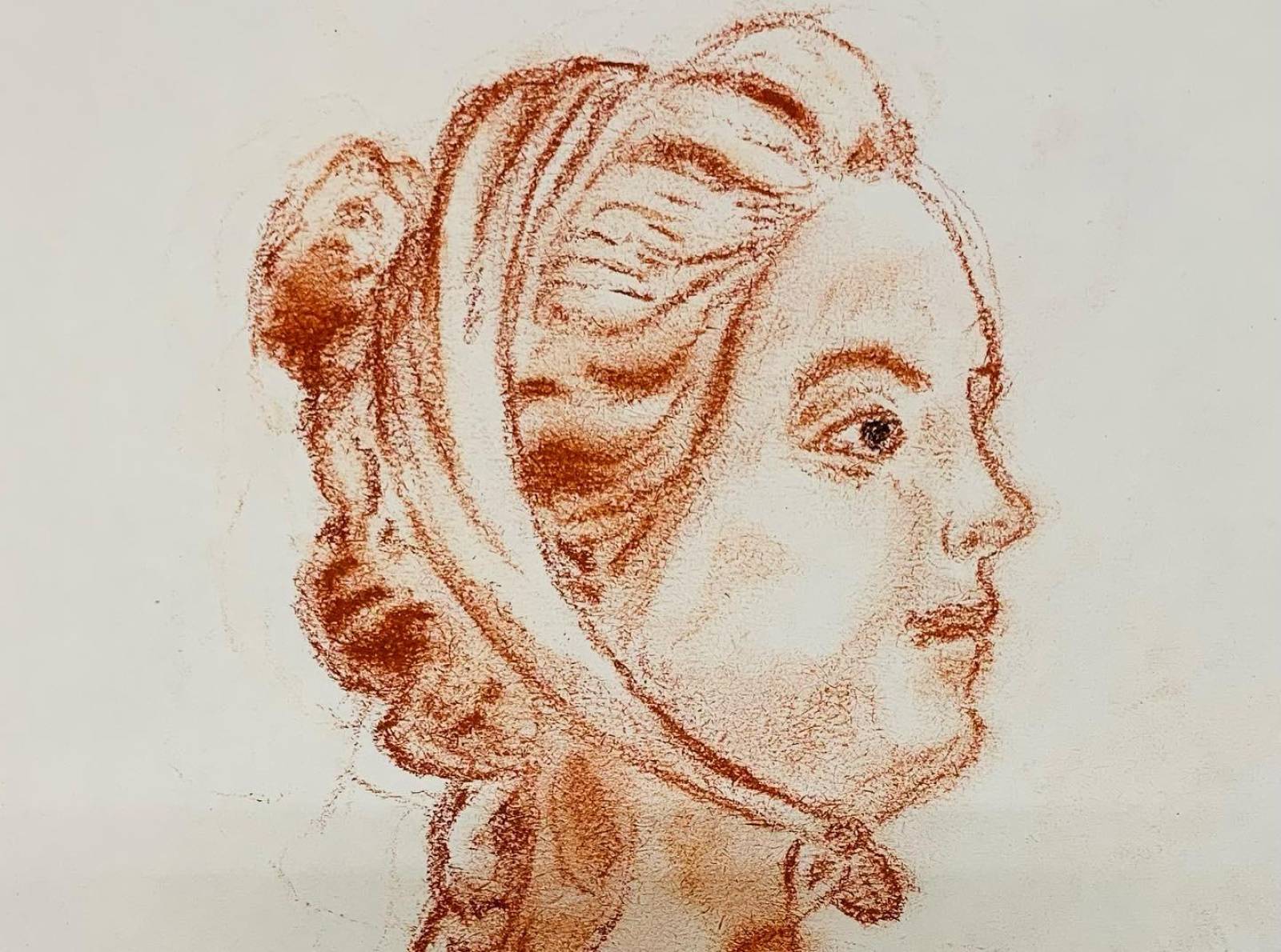 La sanguine est un crayon de couleur ocre-rouge à base d’oxyde de fer, utilisé depuis la Renaissance pour ses qualités chaudes et veloutées.