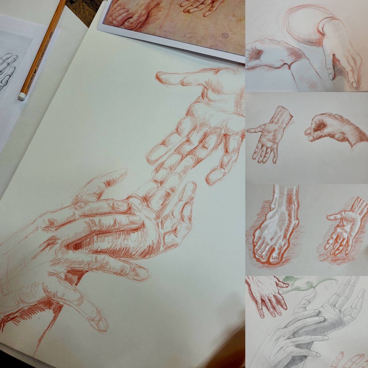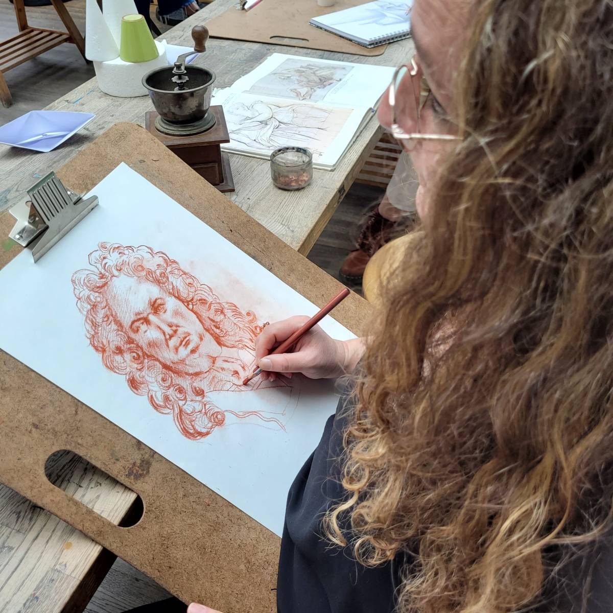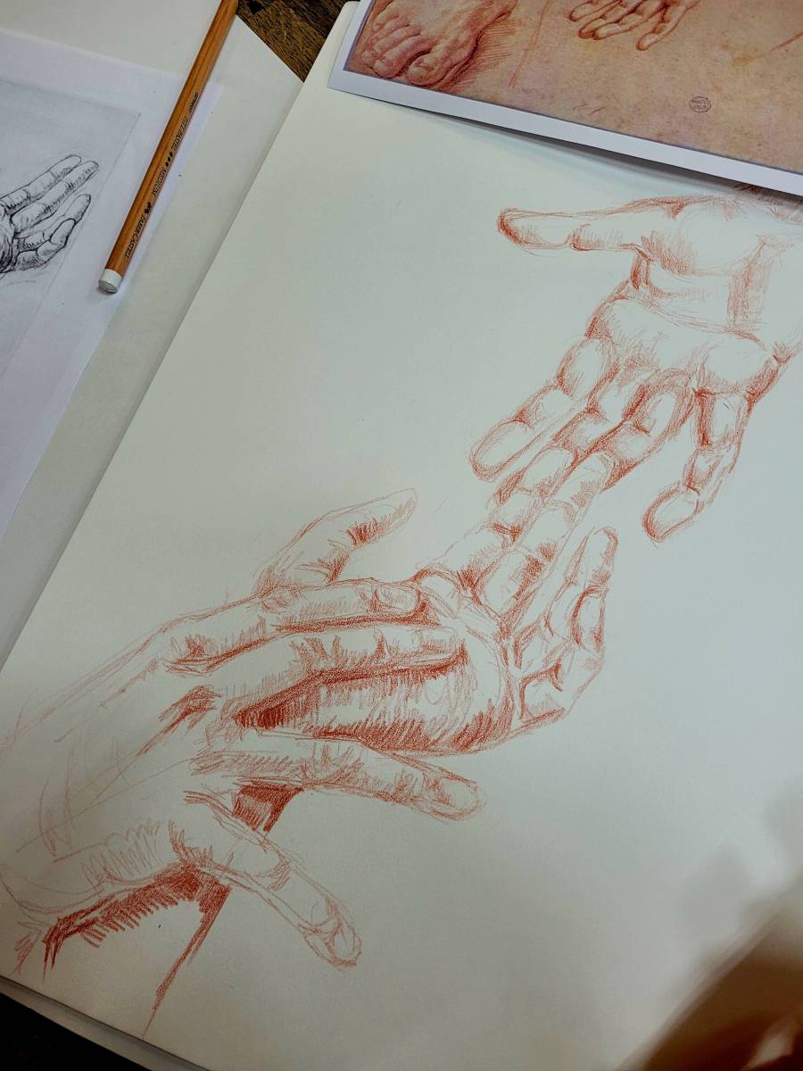 L’apprentissage de la sanguine et de la pierre noire permet de mieux comprendre la lumière, la structure du corps et la force du trait.